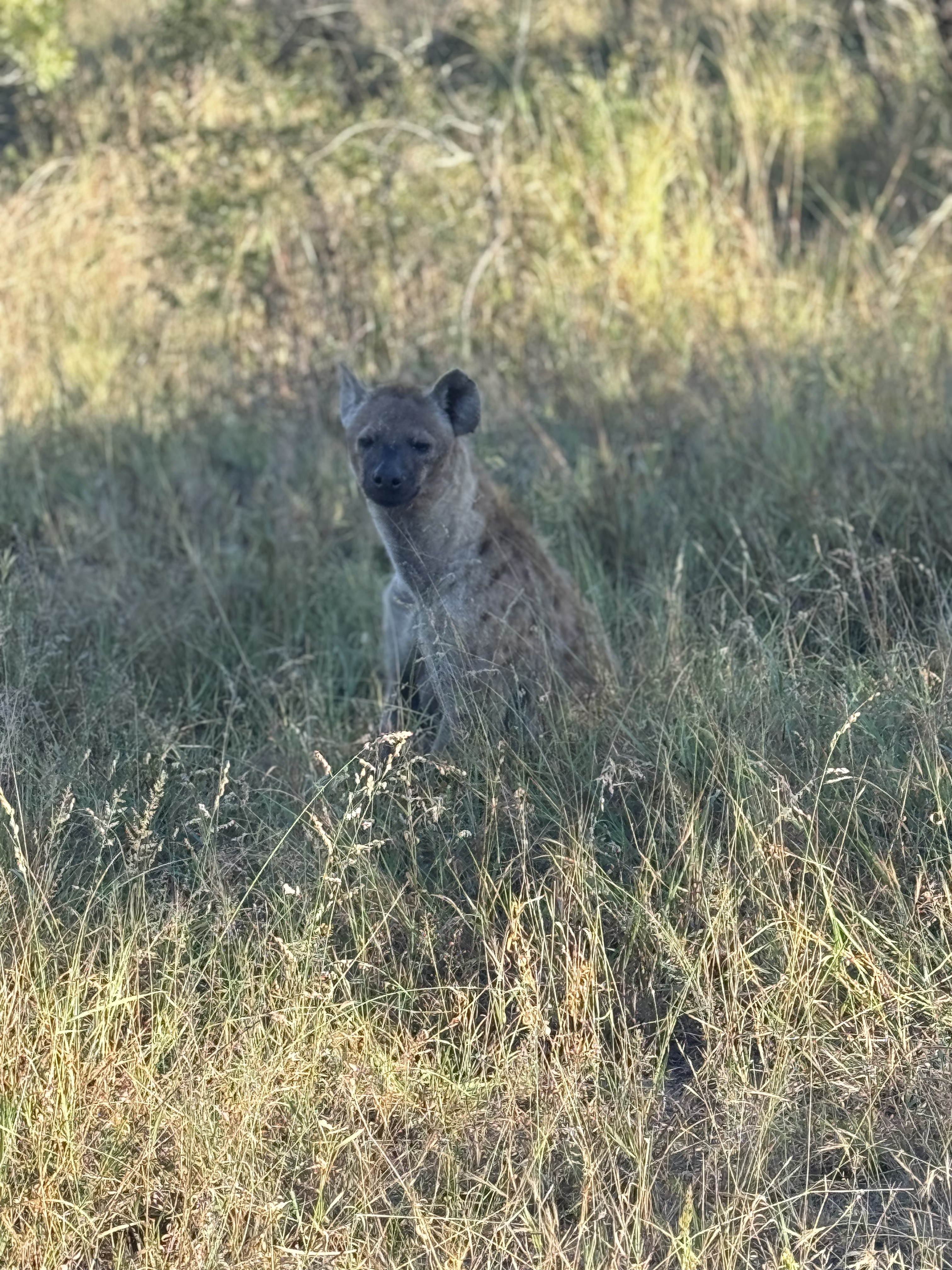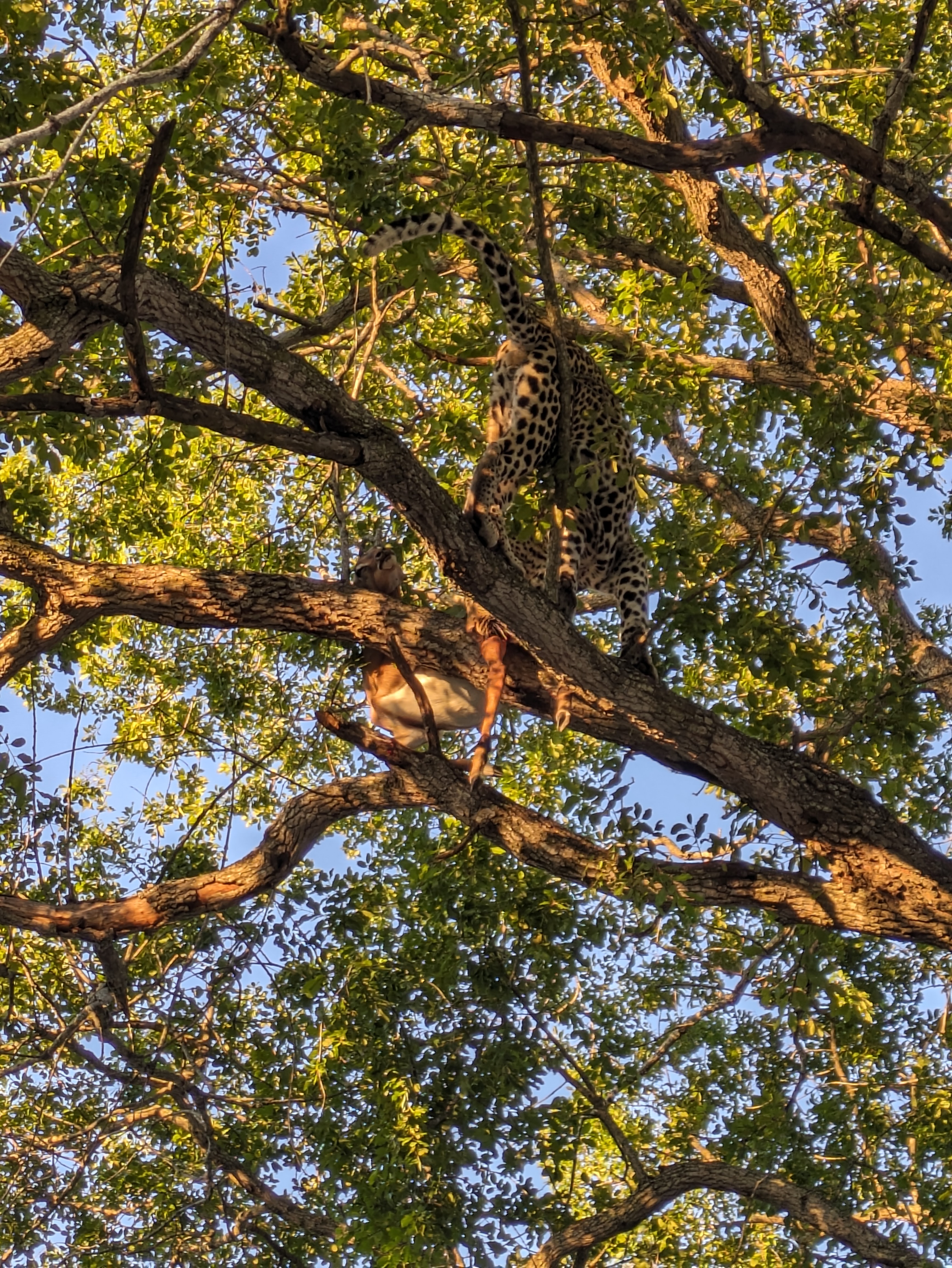 Day 4 was V’s 33rd birthday! We had an amazing start to our morning with not one, but two leopards. Adolescent Nhenhe was in a tree with an impala kill and momma Xidulu was watching from nearby. Nhenhe went straight over to the kill so that his mother couldn’t eat any of it. Our guide says this is normal behavior at his age and that over the next few months Xidulu will spend less time with him and eventually leave him to fend for himself once he can hunt for himself. Xidulu took over the napping branch. Nhenhe was going hard at the leg of the impala kill from the tree. Next thing we know, there are 3 hyenas right by our jeep waiting for scraps. Eventually their patience paid off because the leg fell and all hyenas jumped at the opportunity.