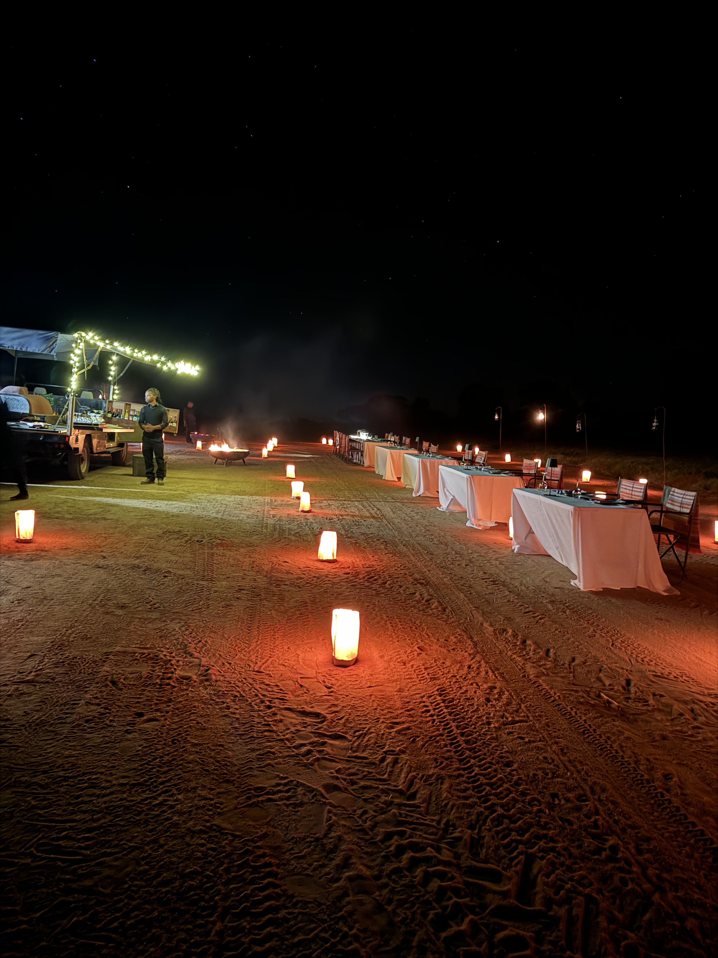 That evening, we went on a game drive. The wildlife here is not as rich with wildlife but it was still cool to get out and see. We saw monkeys and V spotted a “porcupine” turns out it was a pangolin, one of the rarest findings in all of Africa. Our guide Clever almost cried at how amazing it was to see a pangolin, he said it was good luck for life. V and Beef kind of thought the whole pangolin thing was a joke because how insanely excited our guide was but Beef DMed Deon and he confirmed it was an amazing sighting. Sunset was spectacular and then we headed back to camp for dinner on the sand. Excellent meal under the stars, meeting the head chef.