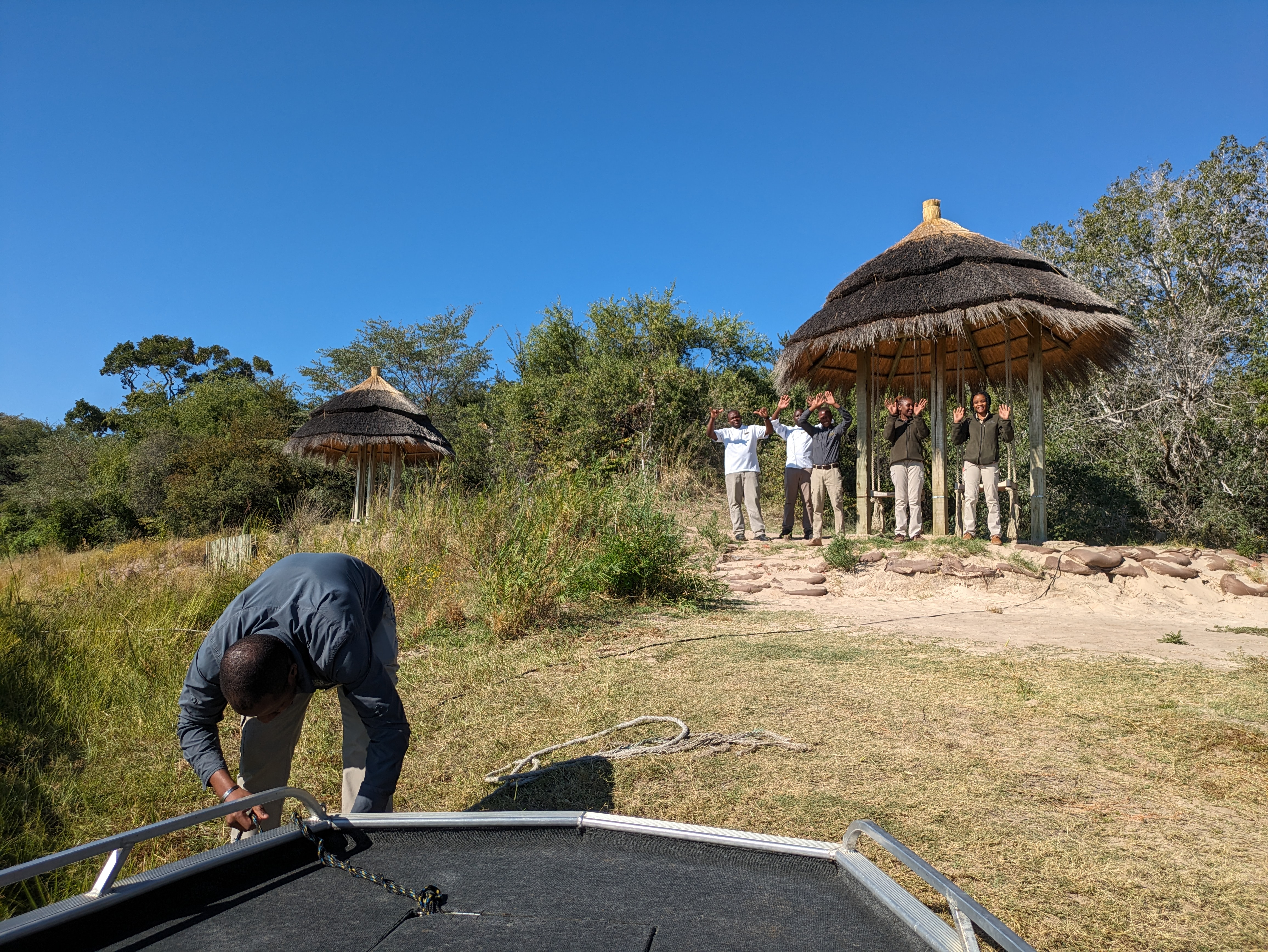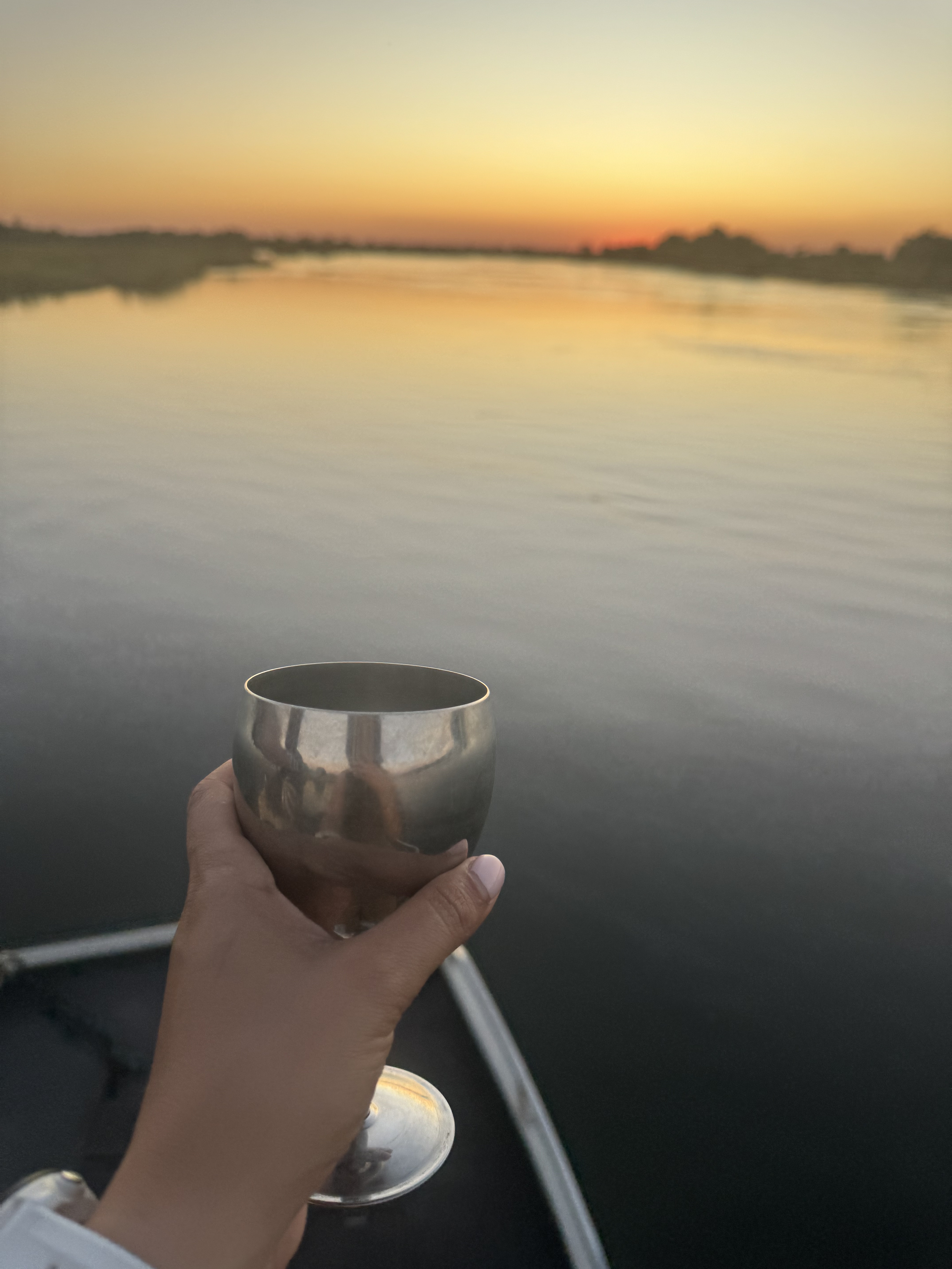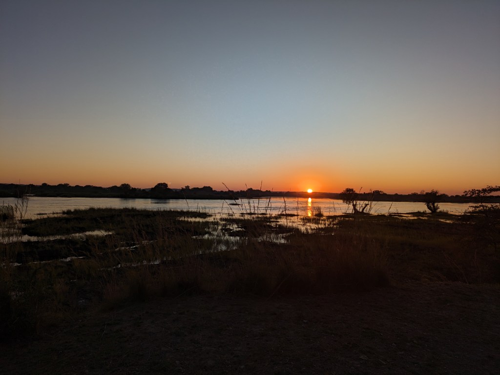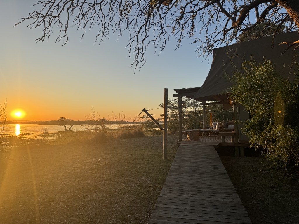 We got dropped off by a little boat on the Zambezi river and got introduced to our boat driver named Wellington, he looked 18, but turns out later he was turning 25. This boat was like a 3 person speed boat. He informed us that the lodge was 25 minutes up river. Next thing we know, we are blasting through this river at like 50MPH dodging hippos and rocks and shallow water; catching air on some waves. This was an absolute crazy experience, but it was clear, our boat driver Wellington knew this waters, like the back of his hand. 25 minutes later we came up to our camp called Mpala Jena Camp. Mpala Jena Camp is set on the southern bank of the Zambezi River, 20km upstream from the Victoria Falls in western Zimbabwe. We splurged on this experience so it was an extremely high quality property, with guest accommodation in just 5 tented suites (there was one other couple there) offering a very wide range of superbly guided activities. Our room was the definition of glamping. It was an amazing “tented” cabin overlooking the river. The room got cold at night so the staff would drop off water heaters to snuggle with. Sunrises from the room were like nothing I’ve ever seen.