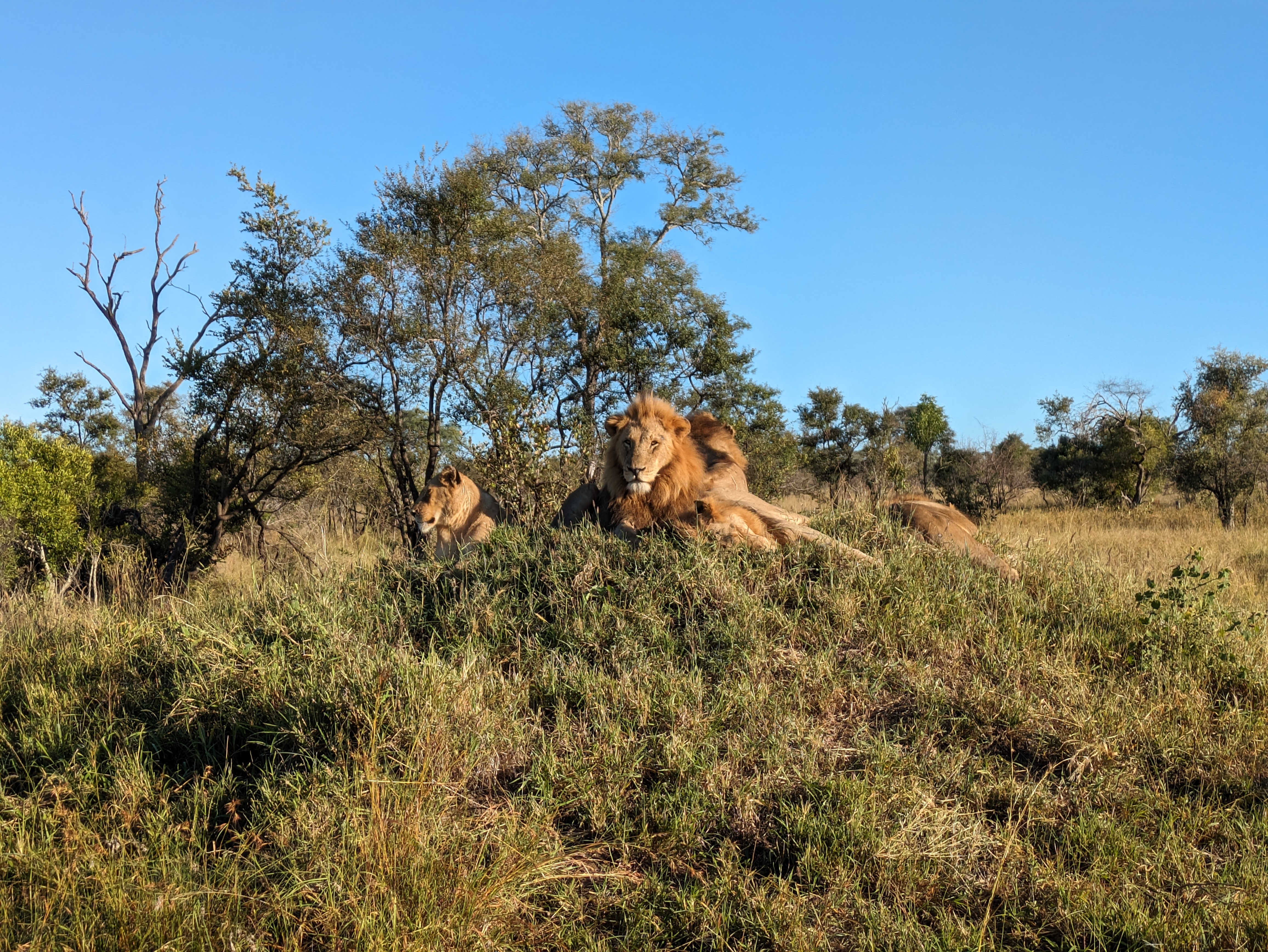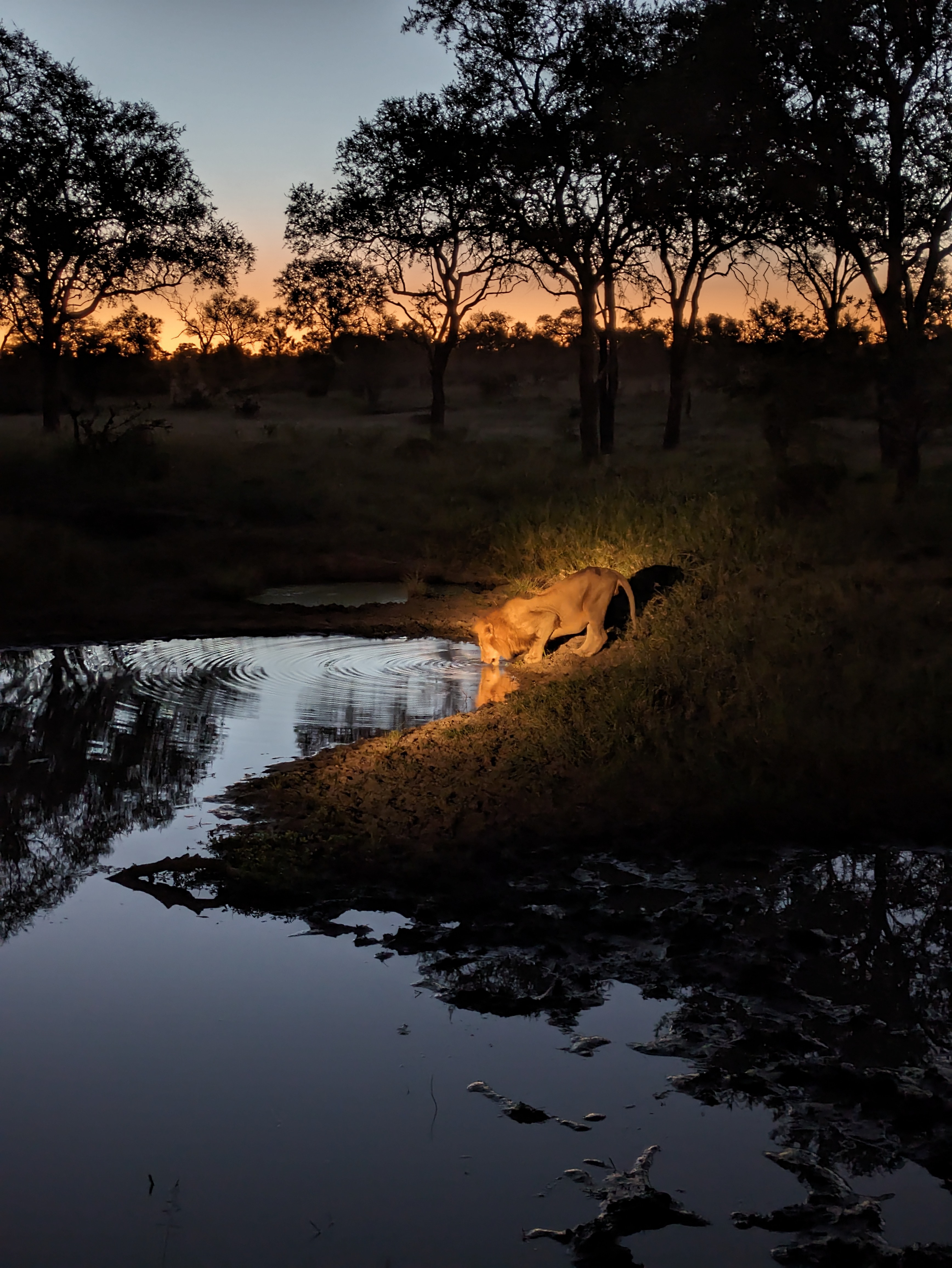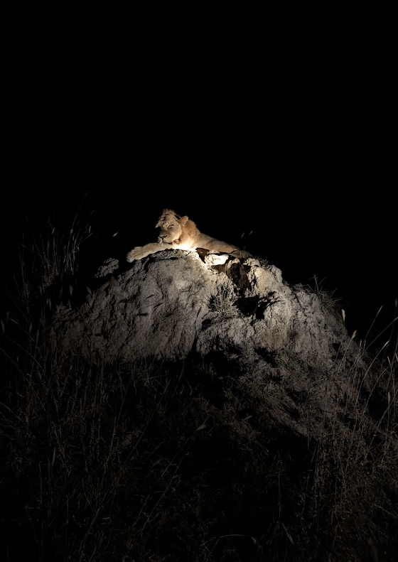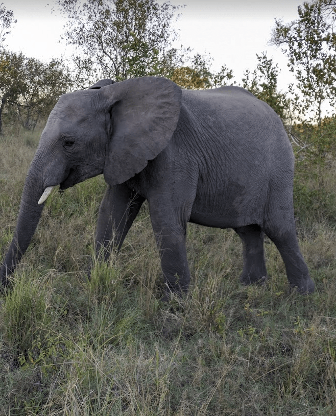 Day 3 morning started with a couple separate rhino spotting’s. With the sunrising the lighting was perfection. The second group of rhinos included a baby, but they would not come out into the open for us.Our guide got a call that there were tracks of african wilds dogs nearby so we headed off to try to intercept them. Wild dogs, also known as painted dogs, are not the most common sighting. They are endangered and they tend to be on the move. We followed these 3 for as long as we could. We kept driving along and saw lots more elephants. This juvenile male elephant decided to trumpet at us as we drove by, it was cute but a little scary. Our guide said was bluffing and he was right because he ran away and hid as we came by. Lastly we found lions! the Kambula coalition of 4 brothers and sister napping on a mound. They were perched in a mound. One had a very healthy mane. We got so close! Other things we saw on our sunset drive were Zebra nicely demonstrating their disruptive coloration by standing in alternate directions. After sunset we ran into the Kambula lions again as they were heading out for the evening. We watched them drink water from a pond, it was insane how close we got this time. For dinner, we jumped into the jeep and got driven a few minutes to an amazing dinner setup. There were little lights on the ground leading us to a private wine tasing followed by a cute cocktail cart and a pizza truck for appetizers. During dinner, Beef was joking around with our guide Deon about lions lurking. Deon laughed and said “no only hyenas” the proceed to shine the light behind us showing all the hyenas waiting for us to finish. Deon told us that they never approach when the guides are around. They know