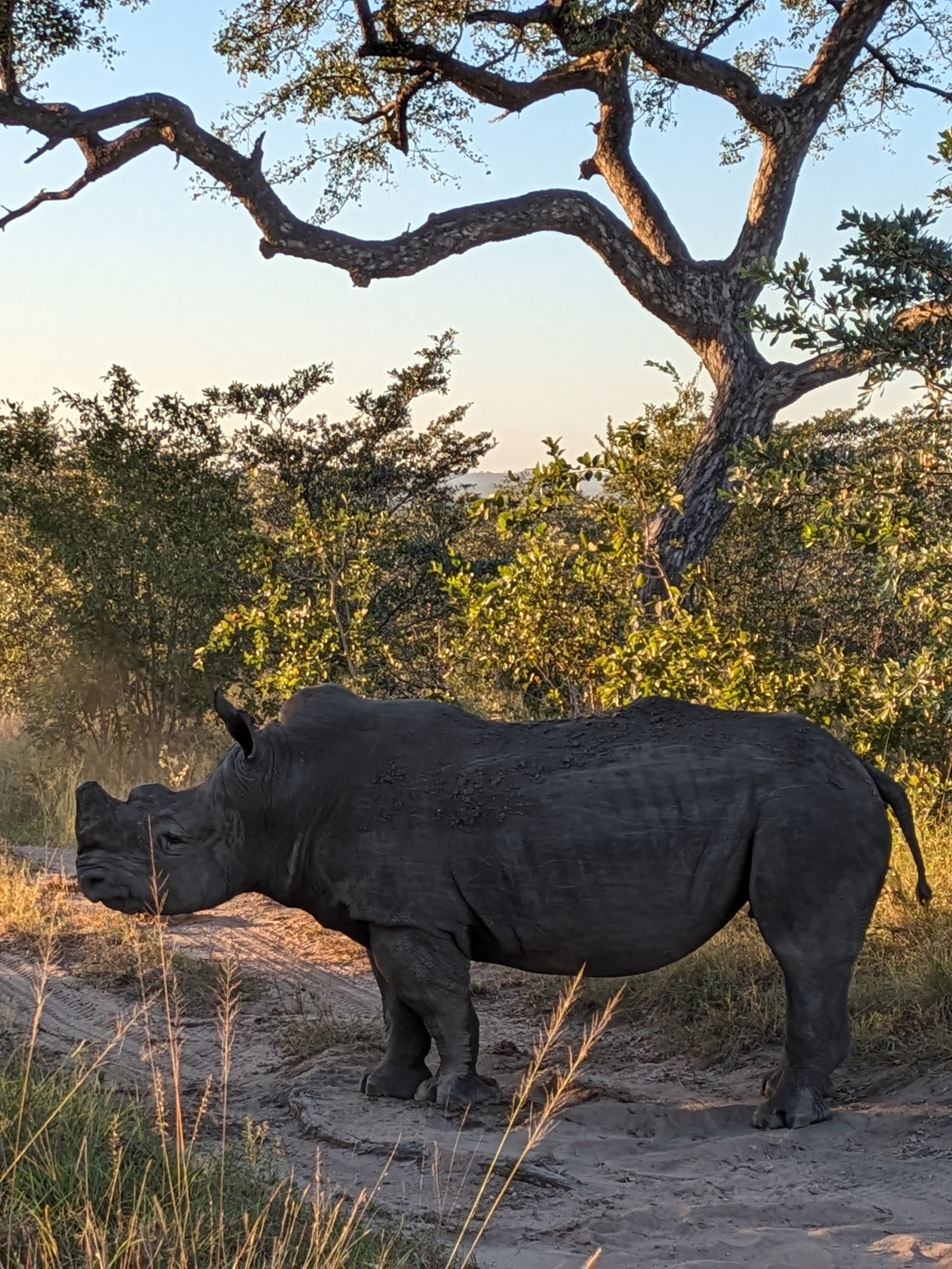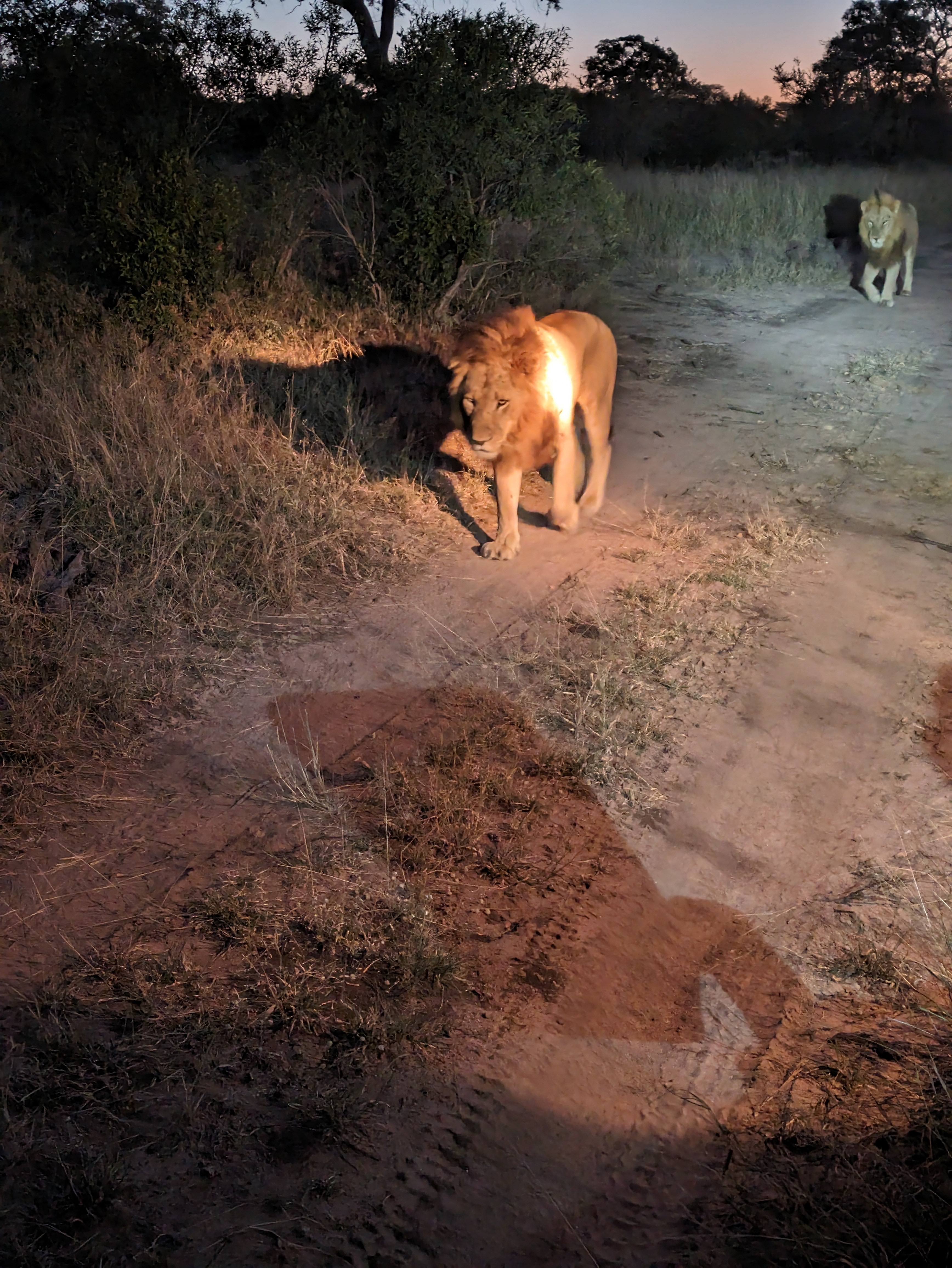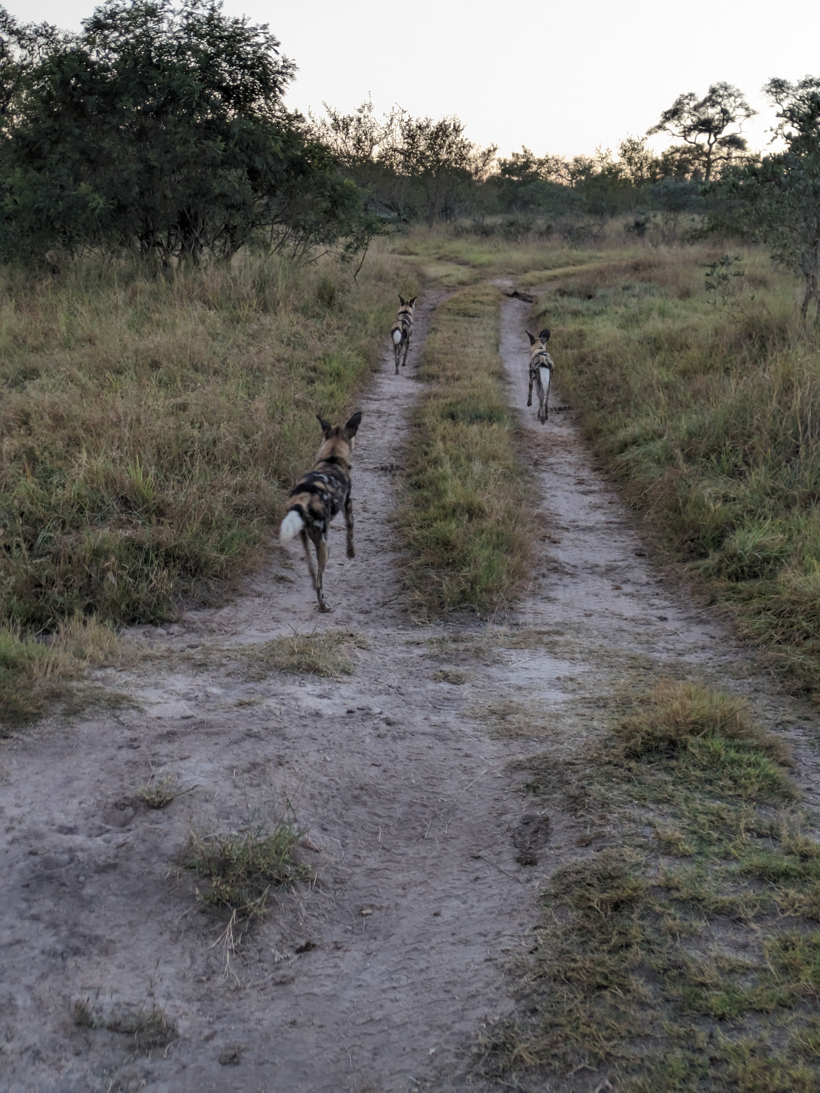 Day 3 morning started with a couple separate rhino spotting’s. With the sunrising the lighting was perfection. The second group of rhinos included a baby, but they would not come out into the open for us.Our guide got a call that there were tracks of african wilds dogs nearby so we headed off to try to intercept them. Wild dogs, also known as painted dogs, are not the most common sighting. They are endangered and they tend to be on the move. We followed these 3 for as long as we could. We kept driving along and saw lots more elephants. This juvenile male elephant decided to trumpet at us as we drove by, it was cute but a little scary. Our guide said was bluffing and he was right because he ran away and hid as we came by. Lastly we found lions! the Kambula coalition of 4 brothers and sister napping on a mound. They were perched in a mound. One had a very healthy mane. We got so close! Other things we saw on our sunset drive were Zebra nicely demonstrating their disruptive coloration by standing in alternate directions. After sunset we ran into the Kambula lions again as they were heading out for the evening. We watched them drink water from a pond, it was insane how close we got this time. For dinner, we jumped into the jeep and got driven a few minutes to an amazing dinner setup. There were little lights on the ground leading us to a private wine tasing followed by a cute cocktail cart and a pizza truck for appetizers. During dinner, Beef was joking around with our guide Deon about lions lurking. Deon laughed and said “no only hyenas” the proceed to shine the light behind us showing all the hyenas waiting for us to finish. Deon told us that they never approach when the guides are around. They know