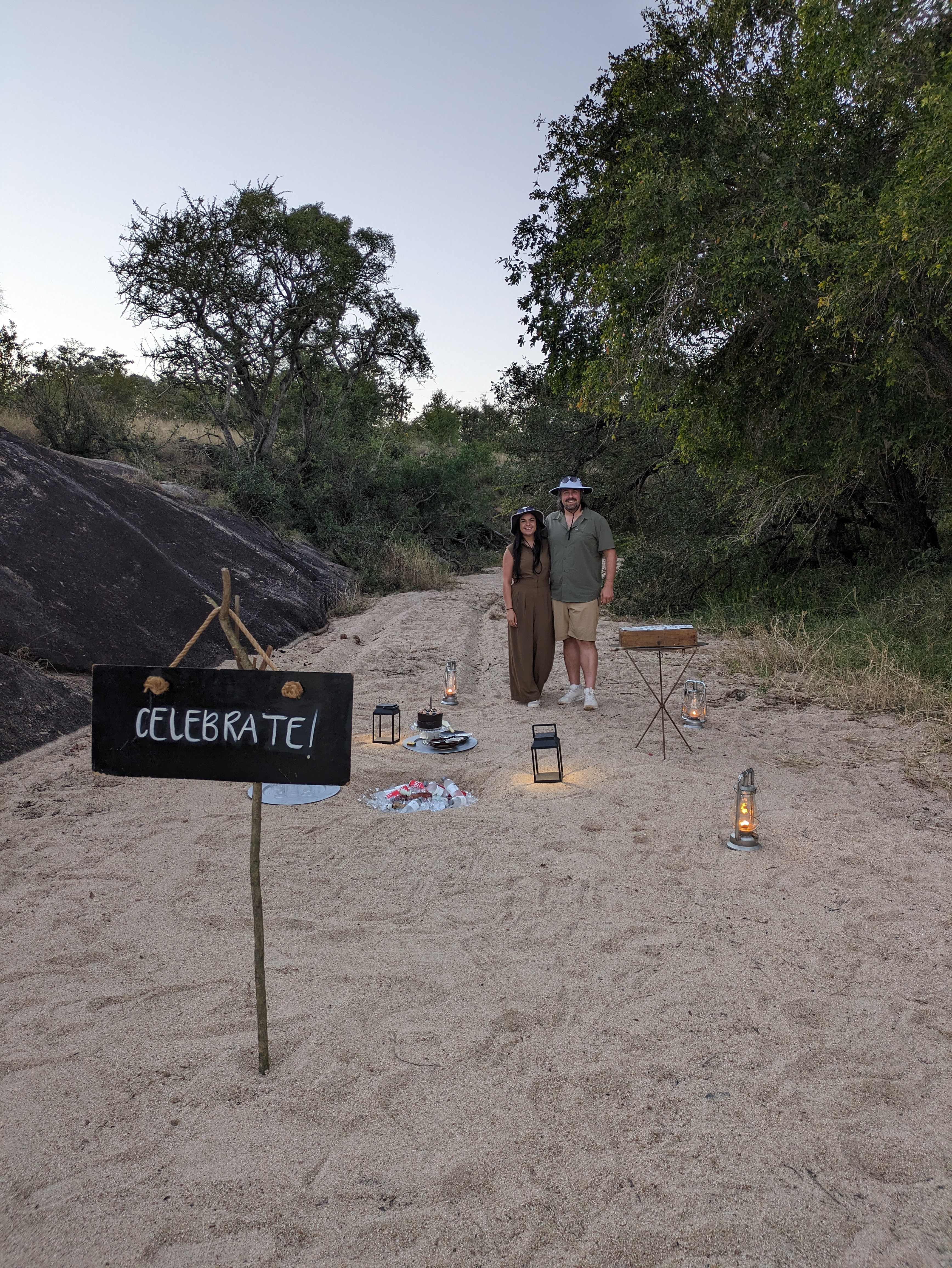 At the resort, V voiced her disappointment for a lack of giraffe so far. Within a couple hours, V saw giraffe from their pool patio at the water hole by her room!!! For our evening drive, V told Deon all she wanted for her birthday was to see some giraffe. Deon being the amazing guide he was spent the next hour tracking giraffe tracks until we were face to face with 3 giraffe!! After that, he drove us to this little area where the beef set up a birthday celebration for me including champagne, cake and snacks. It was super special and V will always remember this birthday. We had a lovely dinner at camp then we got walked back to our room. I am not kidding when I saw I had never seen so many candles and rose petals in my life. The staff completely decorated our room, there were probably 100 candles. Incredibly thoughtful.