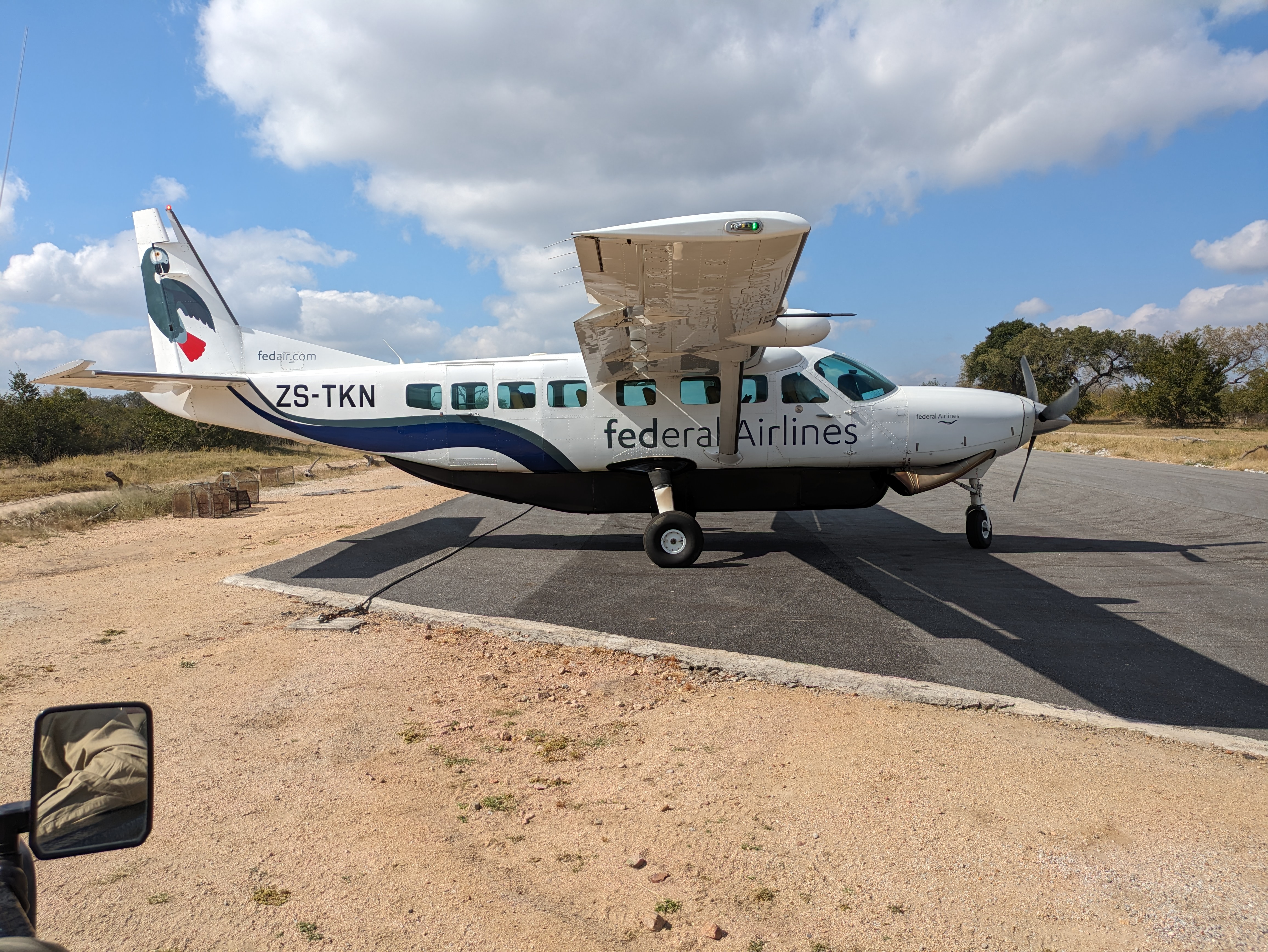 Day 5 we had a morning drive before we checked out of the Chitwa Chitwa. we went back to the leopard tree, Nhenhe was still there in a total food coma. The impala was almost gone, just a couple legs. The stomach contents were on the grass, gross. Leopard belly was big haha. After that we watched some jackals play. Deon spotted some lion tracks so we spent a couple hours hunting for them on some serious off roading and finally came upon a group of lions that were totally camouflaged by the grass. That morning, the staff set up mimosa and coffee in the bush. Very thoughtful. Deon our guide was teaching beef how to hunt for tarantulas, with his bare hands. V walked away. After we got back to the lodge we packed up and checked out. Deon drove us in the jeep to the airstrip and we waited for the tiny plane to land. We got on with 5 other people and off we went to Kruger airport. From there took another flight to Victoria Falls Airport.