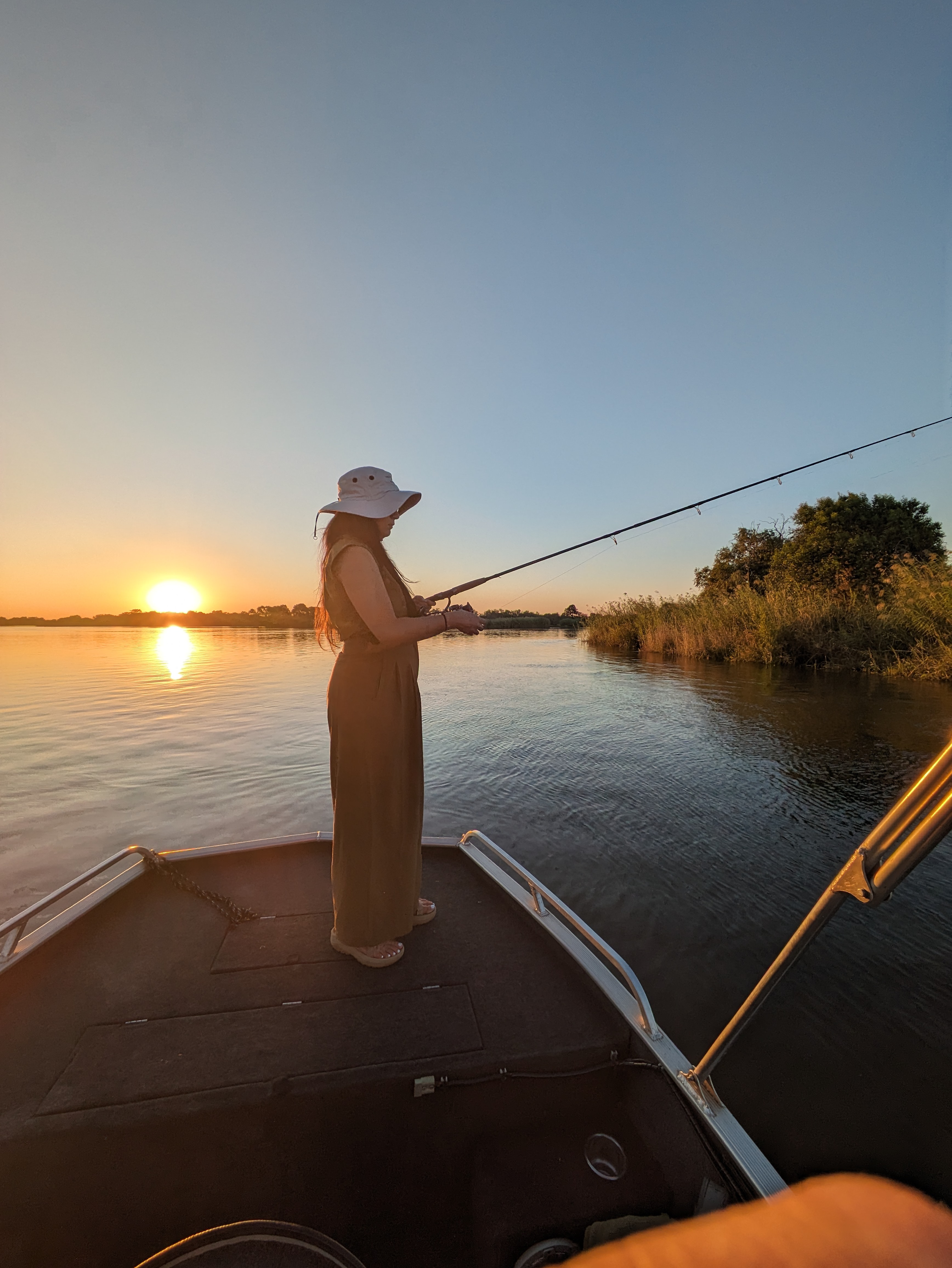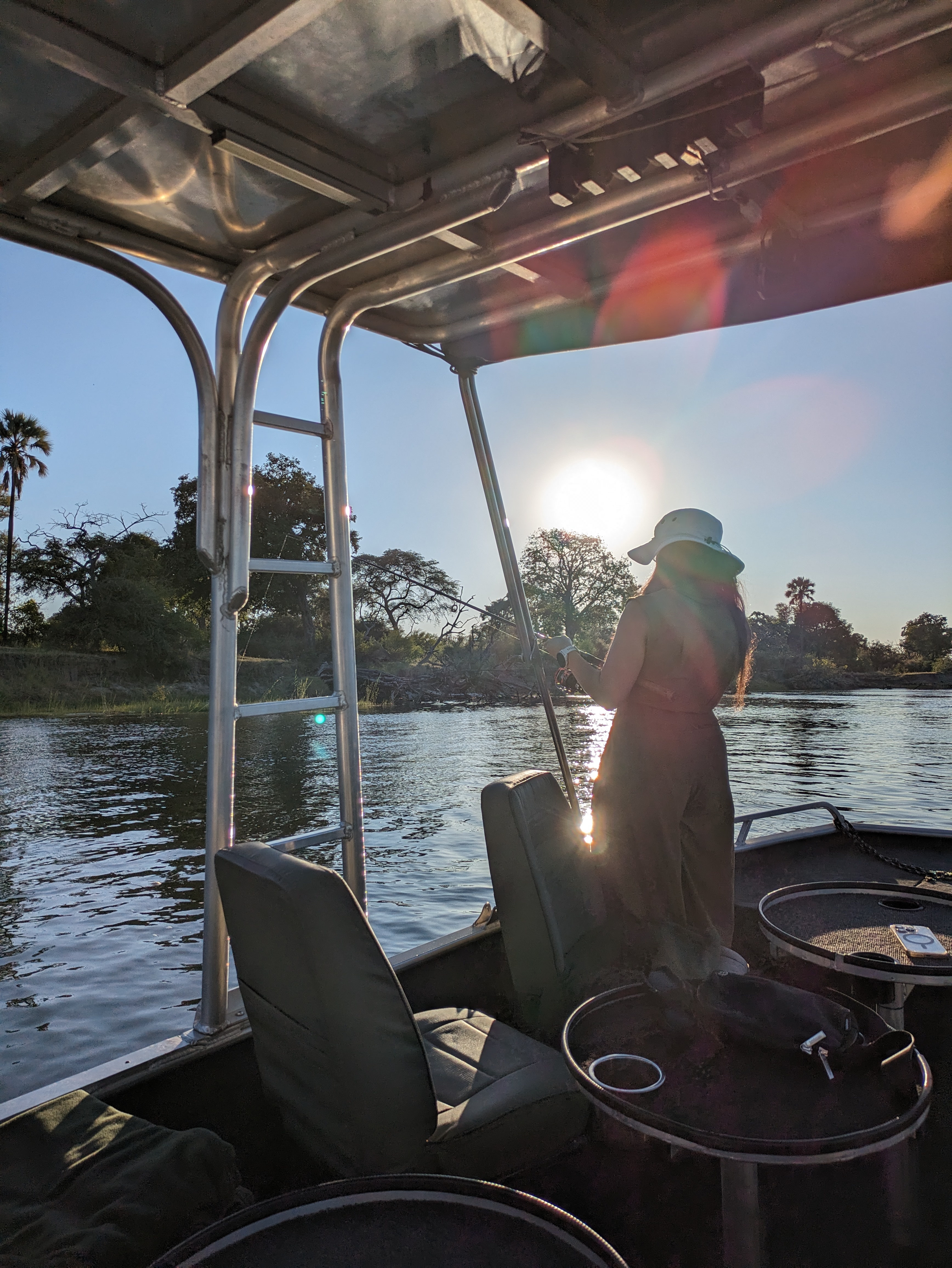 After lunch at the camp we rested for a bit then headed out for evening adventure. Zambezi river safari + fishing! We learned how to fish and caught nothing, not even a nibble, however Beef snagged the boat and some branches and trees. We decided we suck at fishing, but it was really fun. We even had Wellington try…he quickly hooked two fish but couldn’t reel it in. We saw crocodiles and lots of hippos. For sunset we climbed on top of the boat for sunset and had some wine as we watched the most divine sunset over the river. I will never forget this sunset. It was special and the last of our African Safari Trip.
